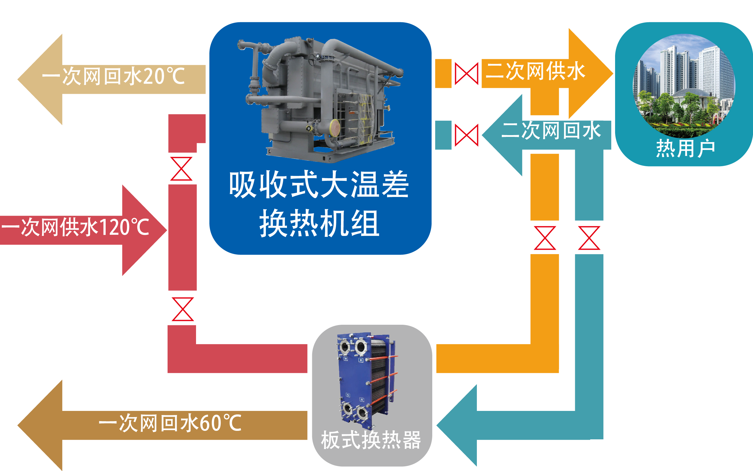 完整的吸收循環(huán)由基于吸收循環(huán)的超大溫差供熱技術和基于吸收式循環(huán)的余熱回收技術組成:在首站增設余熱回收專用機組回收凝氣余熱,解決熱源不足問題;同時在城市換熱站設置吸收式大溫差機組替代原有的板式換熱器,用于降低一次網(wǎng)回水溫度,拉大一次網(wǎng)供回水溫差,解決熱網(wǎng)輸送能力不夠問題。